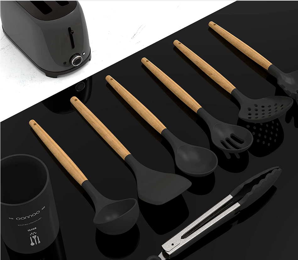 These 14 pieces of cooking utensil set meet basic cooking needs and are essential for the kitchen of a new home or apartment. Each has its own unique use. You can decorate your kitchen by hanging them in the corners of your kitchen through the holes at the top of the wooden handles to keep them organized