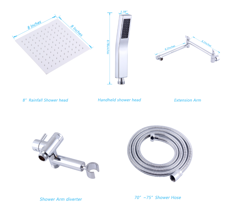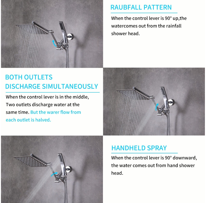• ALL PARTS MADE OF ALL METAL AND BRASS: The rain shower head and handheld spray, the 3- way diverter with holder, extension arm, and the wall-mounted shower arm and flange are all made of all metal and brass. Solid construction ensures more durability than plastic and provides a much longer life.