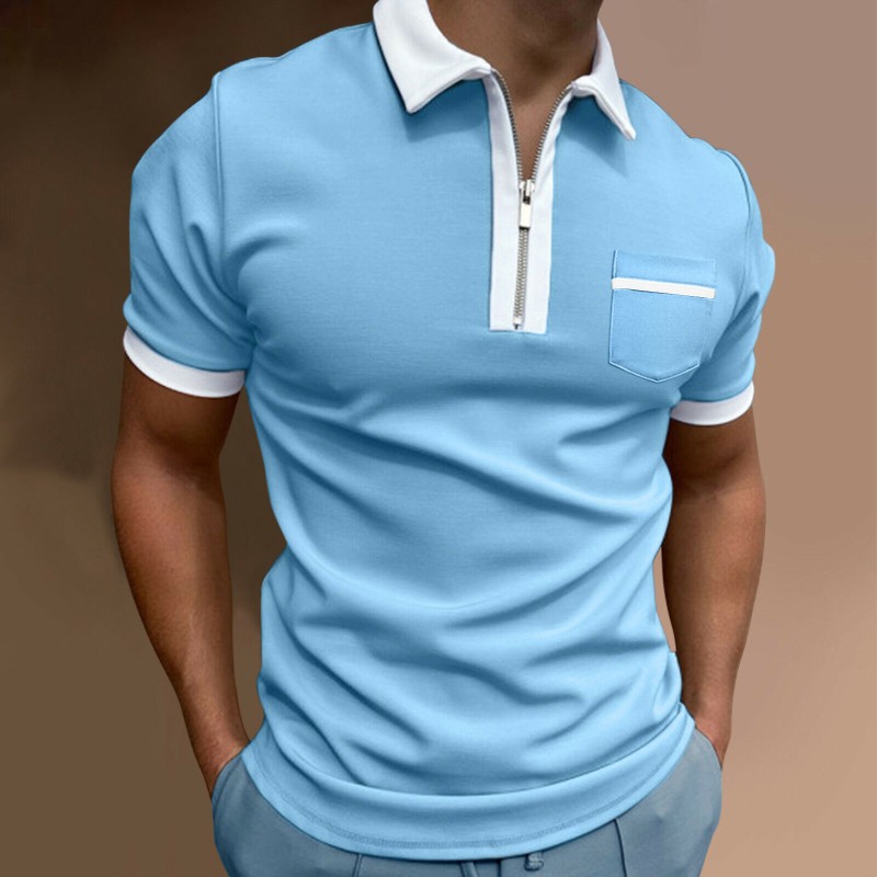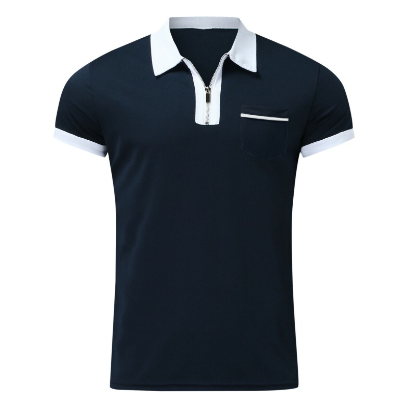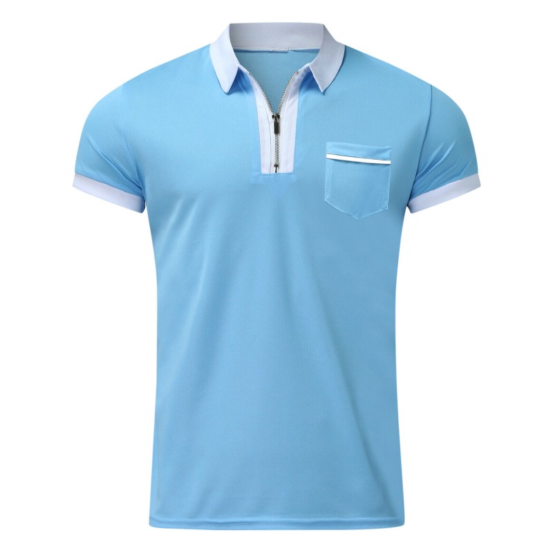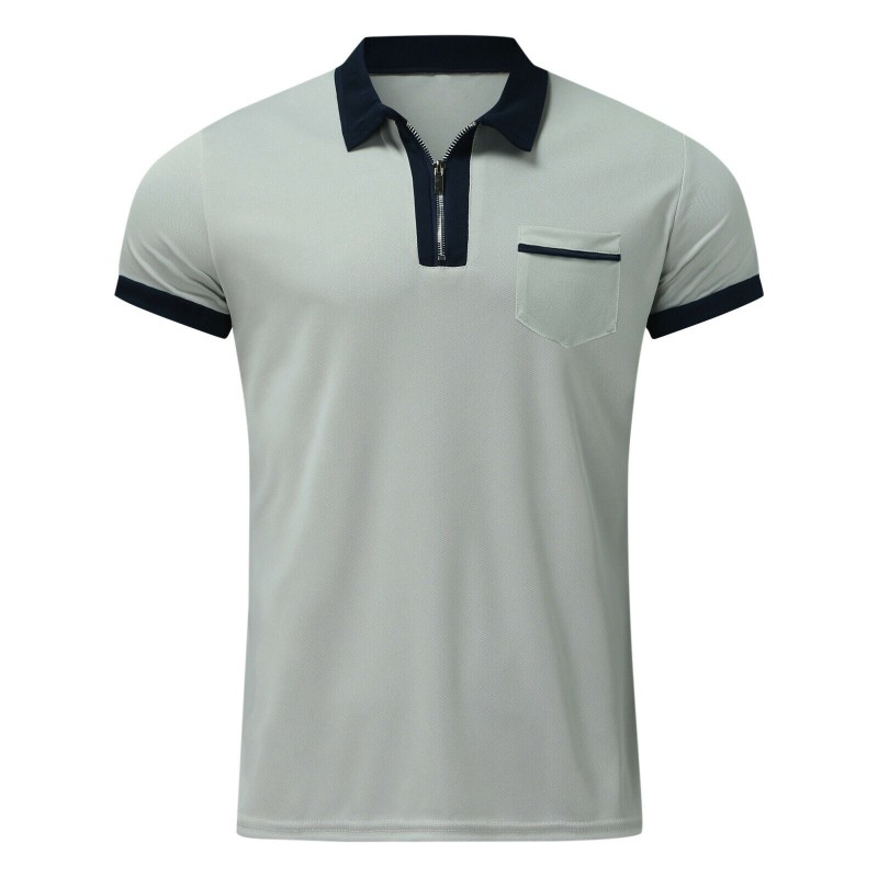 Men Zipper Polo Short Sleeve Shirts Casual Slim Fit Basic Golf Lapel Tee Top
